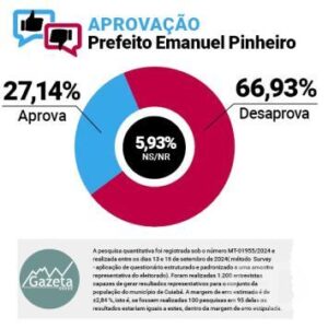A segunda rodada da pesquisa Gazeta Dados revelou que a reprovação à administração do prefeito de Cuiabá, Emanuel Pinheiro (MDB), permanece alta, com 66,93%. O índice se manteve estável em relação ao levantamento anterior, realizado há um mês. Por outro lado, 27,14% dos entrevistados aprovam sua gestão, enquanto 5,93% não souberam ou não quiseram responder.